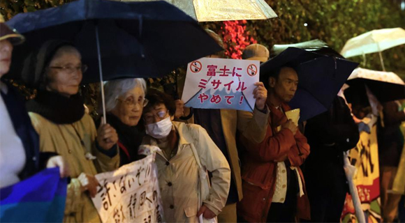 日本防卫省3月31日宣布,在熊本县和静冈县部署了导弹。当天在静冈县,很多民众冒雨前往日本陆上自卫队富士驻屯地门前举行抗议,反对日本政府无视民意,强行部署导弹。抗议人士:正如刚才最后的请求中提到的,日本政府部署导弹无视日本宪法,日本政府应该专注于本职工作,保护国民的生命与生活。
