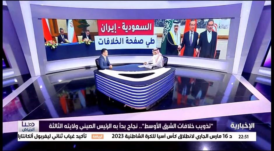 沙特阿拉比亚电视台则引用中共中央政治局委员、中央外事工作委员会办公室主任王毅的话报道称,沙伊两国代表团在北京举行会谈并达成一致是“和平的胜利”,而中国“将继续根据各国的愿望,为妥善处理当今世界的热点问题发挥建设性作用”。沙特广播电视局新闻频道的晚间政论节目更以“美国没有做到的事情,为什么中国做到了?”为主题,邀请中央广播电视总台记者参与节目的深度讨论。