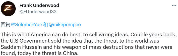 网友@Frank Underwood表示,美国最擅长向世界兜售错误观点。过去,美国政府兜售的谎言是,伊拉克拥有大规模杀伤性武器,会对世界产生威胁,然而这根本没被找到过;而在今天,美国政府兜售的谎言又变成了“中国是个威胁”。