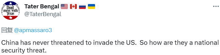 网友@Tater Bengal质疑道,中国从未威胁过要入侵美国。那么中国如何成为美国的国家安全威胁?