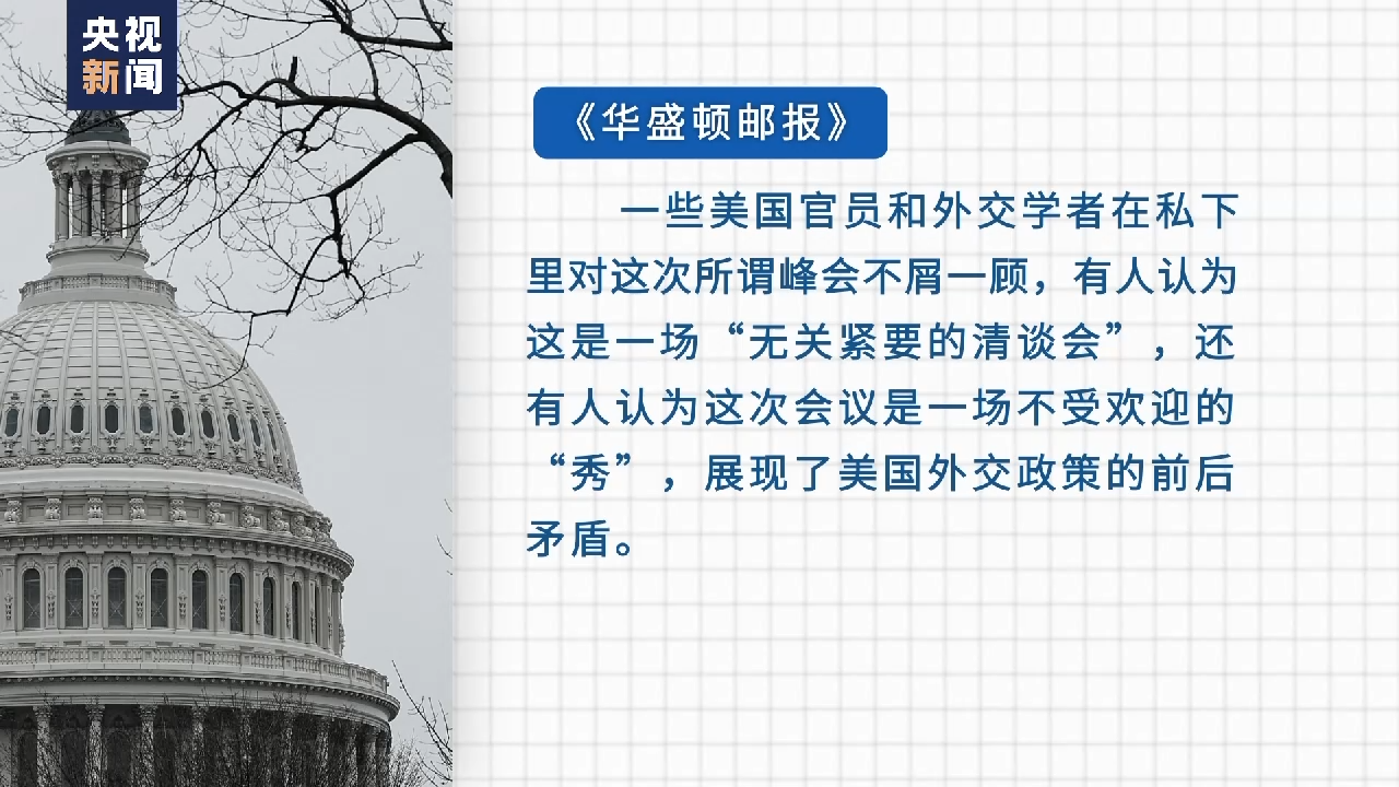 《华盛顿邮报》称,一些美国官员和外交学者在私下里对这次所谓峰会不屑一顾,有人认为这是一场“无关紧要的清谈会”,还有人认为这次会议是一场不受欢迎的“秀”,展现了美国外交政策的前后矛盾,因为美国在某些情况下号称支持所谓人权,而在另一些情况下却视而不见。