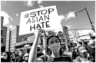 图为人们在美国纽约华人聚居区法拉盛参加集会。当日,美国多地民众举行游行集会,抗议针对亚裔的歧视和仇恨犯罪。新华社记者 王迎摄