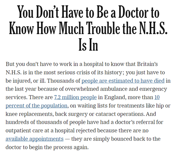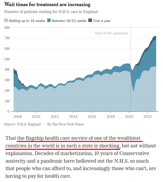 按照《纽约时报》的说法,英国国家医疗服务体系如今的状态令人震惊,让医务人员和患者都为这一系统的崩溃付出了代价。