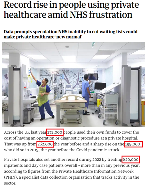 据英国《卫报》报道,2022年,全英国有27.2万人用自己的钱在私立医院做手术或看病,比2021年的26.2万人有所增加;比新冠疫情暴发前一年,也就是2019年的19.9万人有大幅增加。
