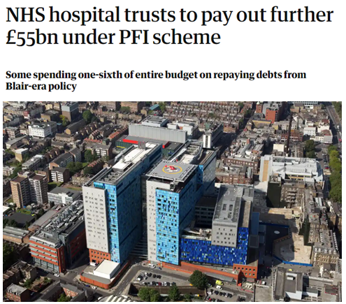 20世纪90年代末和21世纪初,英国前首相托尼·布莱尔领导的工党利用与私人投资者合作的资金建造了数十家新医院,新医院背负着巨额贷款和利息,至今仍拖欠数百亿英镑。