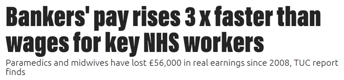 英国工会联盟的一项分析显示,自2008年国际金融危机以来,英国银行家薪酬增长速度是护士的3倍多。