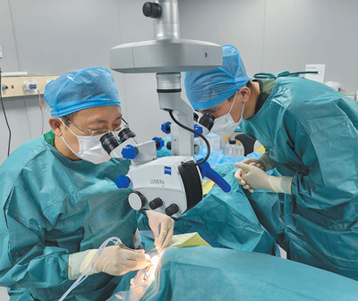 北京大学人民医院主任医师曹晓光(左)与一名乌兹别克斯坦医师共同为当地患者进行白内障手术。鲍永珍摄