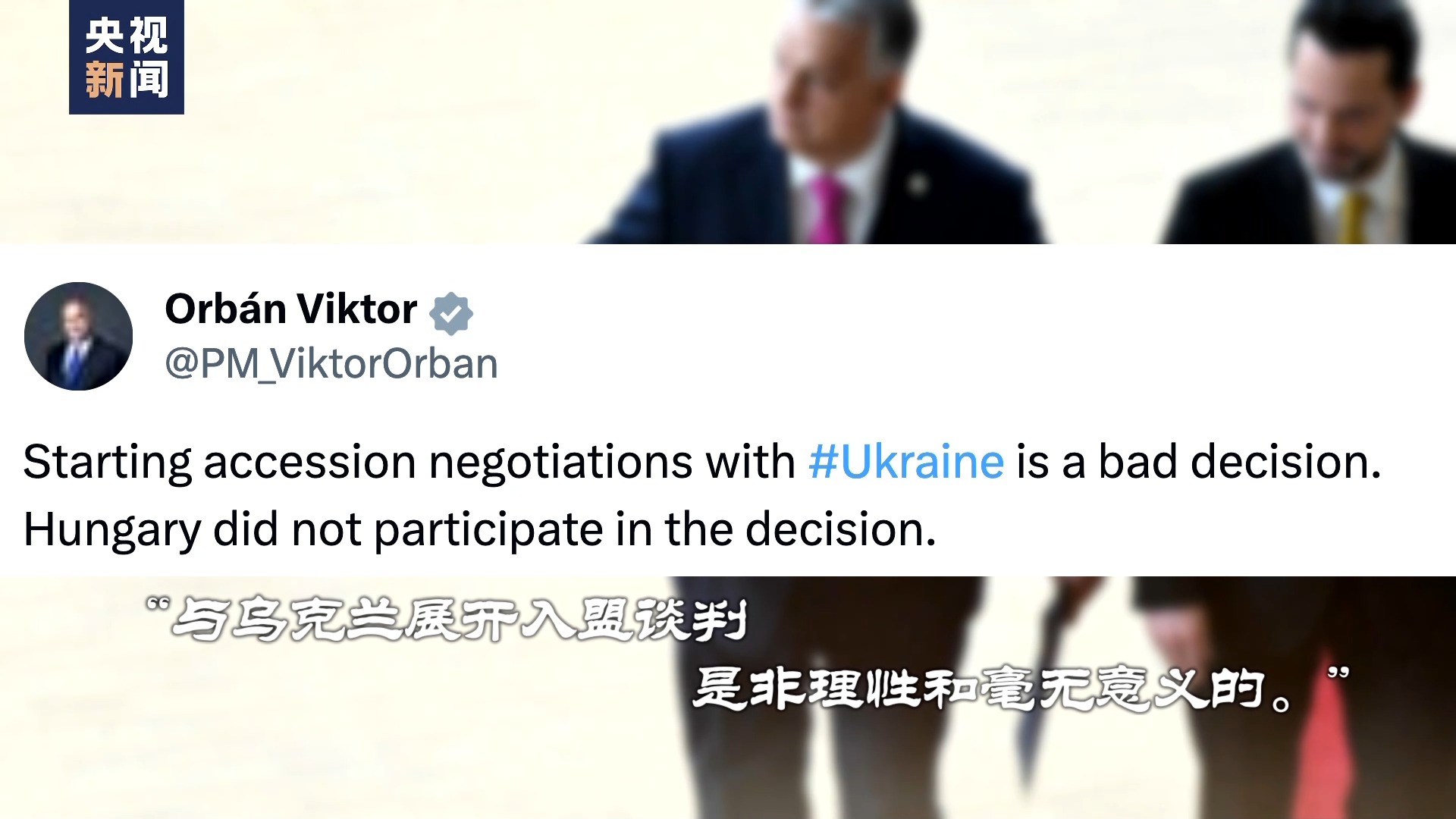 而当日投票结束后,欧尔班在社交媒体上表示,与乌克兰展开入盟谈判是非理性和毫无意义的。