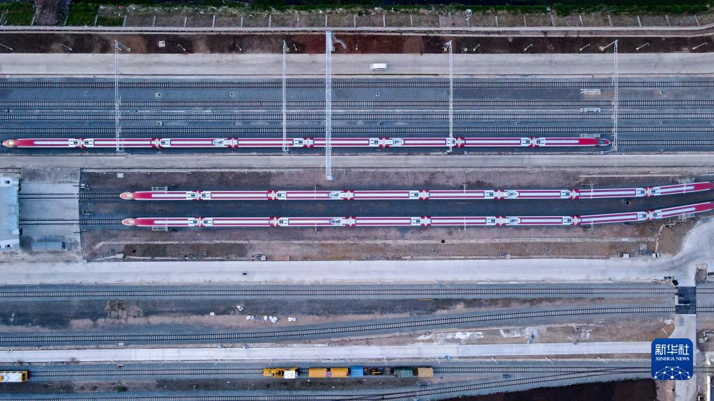 8月17日,在印度尼西亚万隆,雅万高铁高速动车组停靠在雅万高铁德卡鲁尔动车所附近。
