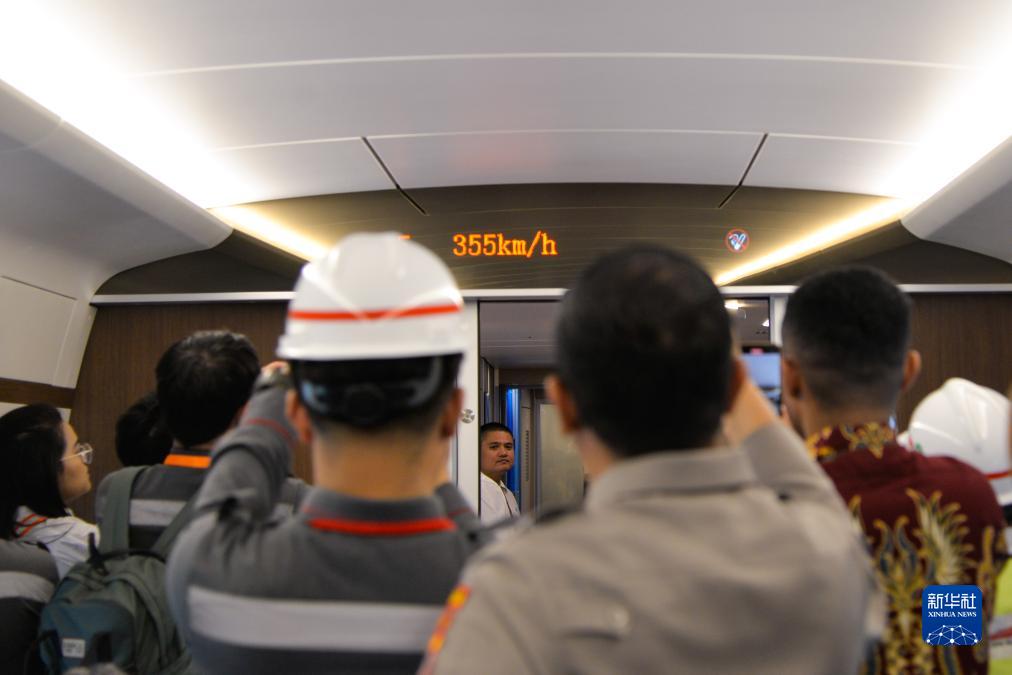 6月22日,在印度尼西亚雅万高铁进行联调联试的综合检测列车上,记者和工作人员拍摄显示列车时速超过350公里的电子屏。