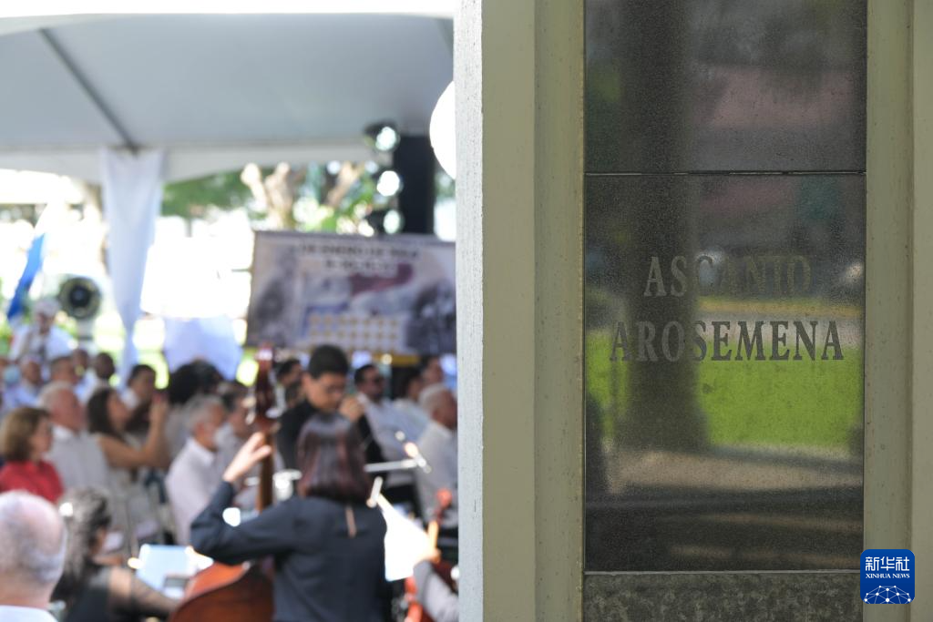 1月9日,在巴拿马首都巴拿马城,巴拿马政府在“永恒之火”纪念碑旁举办“护旗运动”60周年纪念仪式,照片中的石柱纪念的是在美国军警镇压中死亡的第一位学生阿罗塞梅纳。新华社记者 陈昊佺 摄