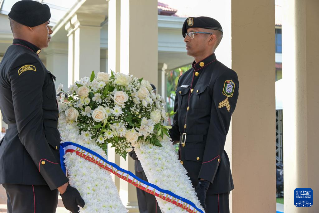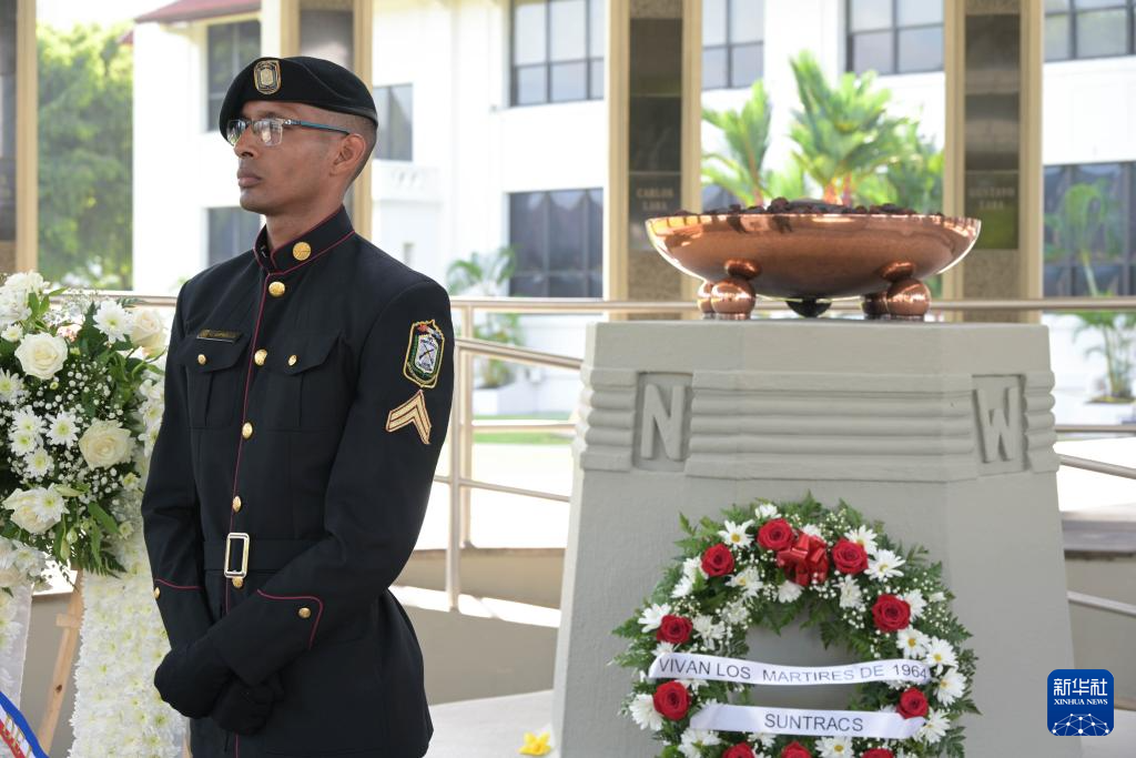 1月9日,在巴拿马首都巴拿马城,两名士兵向纪念“护旗运动”的“永恒之火”纪念碑献花圈。新华社记者 陈昊佺 摄