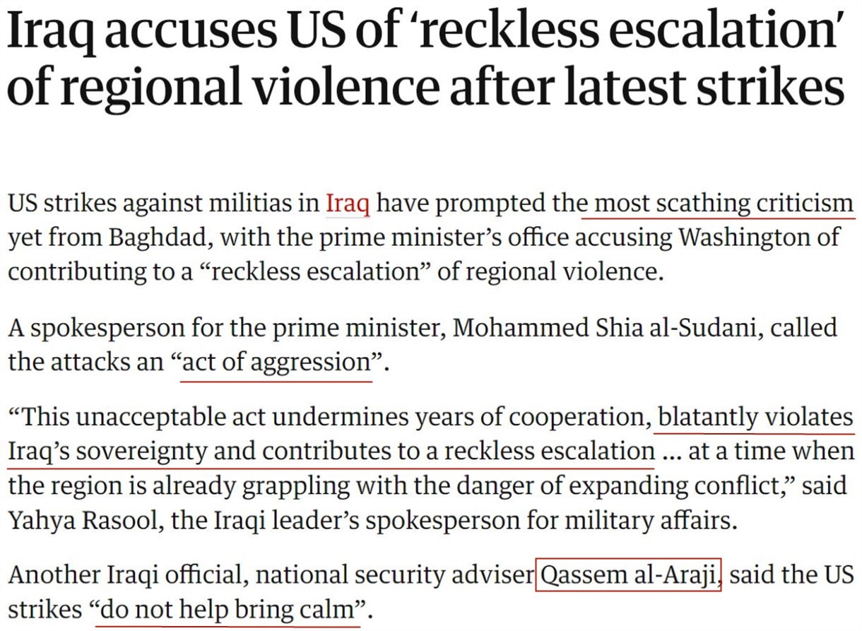 伊拉克总理媒体办公室同一天也发表声明,强调美军对伊拉克多地军事目标发动空袭破坏伊拉克安全稳定,伊拉克将这些行为视作侵略,将采取必要措施维护伊拉克人民的安全。