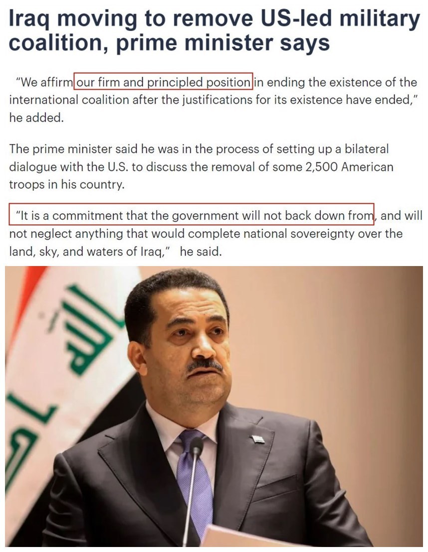“伊拉克政府有能力维护伊拉克主权、安全和人民的尊严,这是政府对国家和人民的义务、责任,符合伊拉克宪法的核心原则。在此,我们重申推动结束国际联盟在伊拉克境内存在的坚定立场。我们正在通过双边委员会确定对话开始日期,该委员会的成立是为了推动国际联盟撤离伊拉克的进程,伊拉克在这一承诺上不会退缩,伊拉克对本国境内陆域、空域拥有完整主权。”