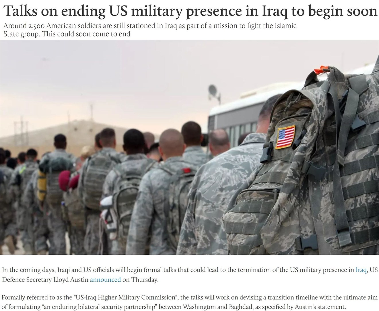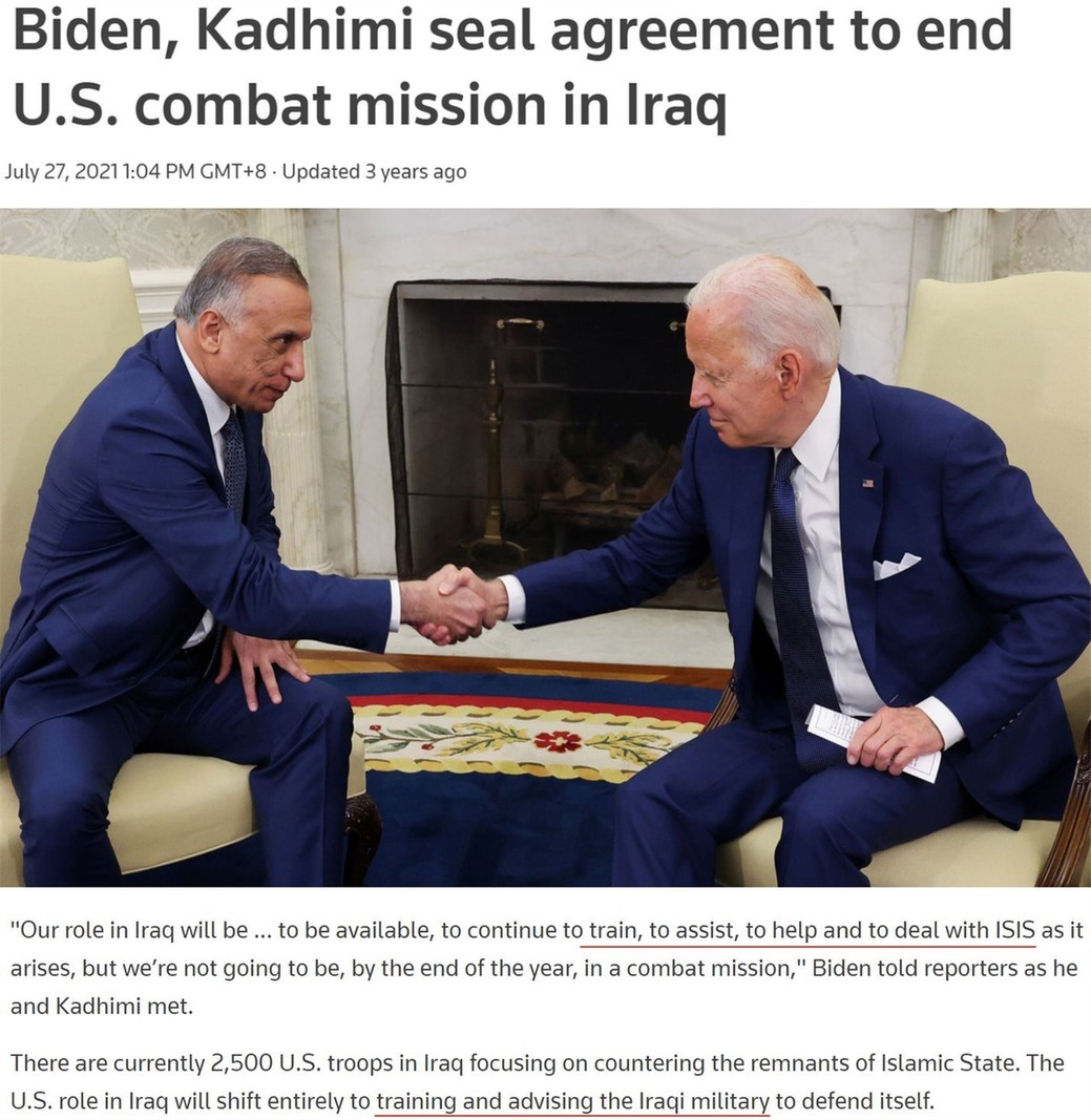 2021年7月,美国总统拜登在华盛顿与时任伊拉克总理卡迪米会晤时就表示,到2021年12月31日,伊拉克境内将不存在承担作战任务的美军。