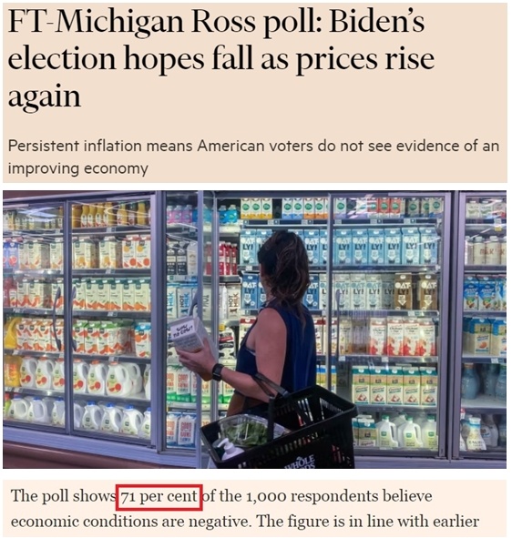 英国《金融时报》和美国密歇根大学罗斯商学院联合进行的最新民调显示,71%的受访者认为,美国经济状况不佳。分析称,连续三年的高通胀打击了消费者情绪。