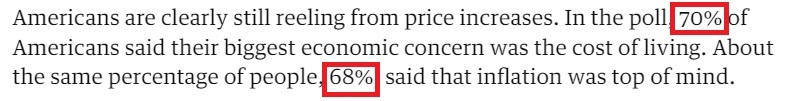 在《卫报》发布的民意调查中,有70%的受访者表示,他们最大的经济担忧是生活成本;大约同样比例的人(68%)说,通货膨胀是他们最关心的问题。