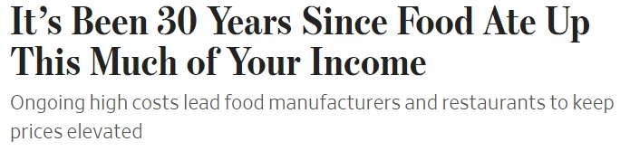 《华尔街日报》报道称,持续的高成本导致食品制造商和餐馆继续抬高价格,“食物支出‘吃掉’这么多收入,已经是30年前的事”。