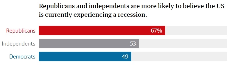 哈里斯民调公司进行的民调显示,67%的共和党人认为,美国经济正在萎缩,通货膨胀正在加剧,整体经济正在恶化;而民主党人中持相同观点的人只有49%;此外,共和党人比民主党人更加相信,拜登政府的管理不善导致经济恶化。