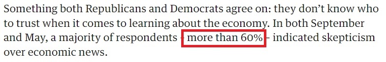 而无论是共和党人还是民主党人,几乎所有受访者都同意的一点是:在了解经济情况方面,他们不知道该相信谁。民调显示,超六成美国人对经济新闻的真实性表示质疑。