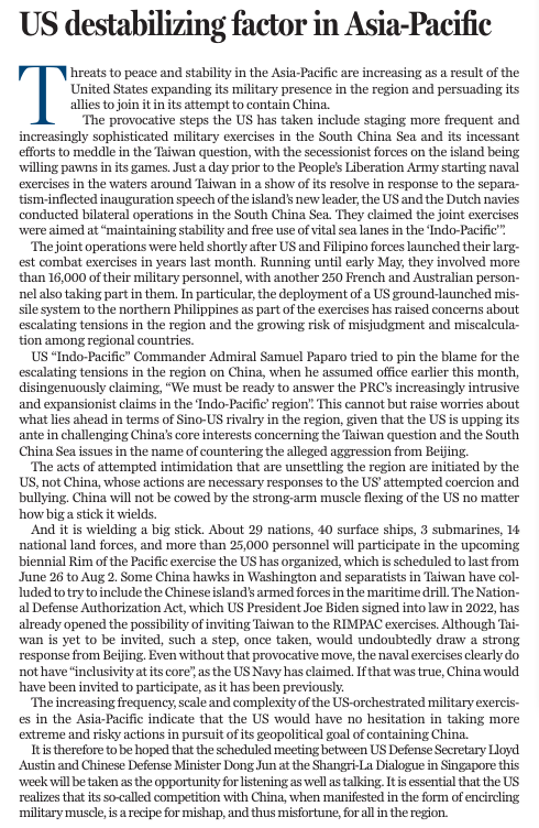 美国的霸权行径导致亚太动荡不安,中国的行动是对美国胁迫和欺凌的必要回应。无论美国掀起多大的风浪,中国都不会被吓到。无论美国挥舞着多大的棍棒,中国都不会屈服。