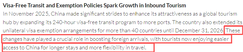 文章分析认为,2025年11月,中国将240小时过境免签政策扩大到更多口岸,并将40余国单方面免签政策延长至2026年12月31日,以增强中国作为全球旅游目的地的吸引力。 这些变化在促进外国游客入境方面发挥了至关重要的作用,游客现在可以更轻松地入境中国,停留更长时间,旅行方式也更加灵活。