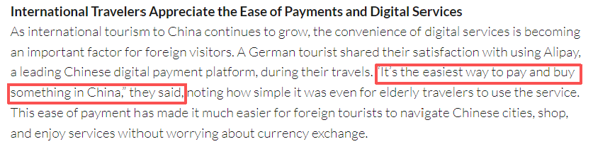文章分析说,随着中国国际旅游业的持续增长,数字服务的便利性正成为外国游客考虑的重要因素。一位德国游客分享了他对使用中国领先的数字支付平台的满意度。他说:“ 这是在中国支付和购物最简单的方式。”他说,这种便捷的支付方式使外国游客更容易在中国城市中导航、购物和享受服务,而不用担心货币兑换问题。支付方式和其他服务的数字化正使中国作为旅游目的地的吸引力越来越大。