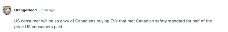 “美国消费者会非常羡慕加拿大人,因为他们能以美国消费者一半的价格买到符合加拿大安全标准的电动汽车。”↓