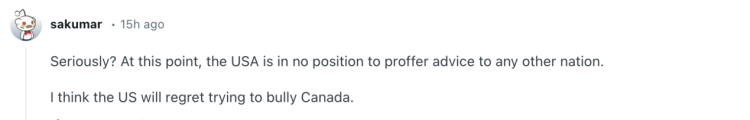 “真的吗?在这点上,美国根本没有资格对其他国家指手画脚。我认为美国会后悔试图霸凌加拿大。”↓