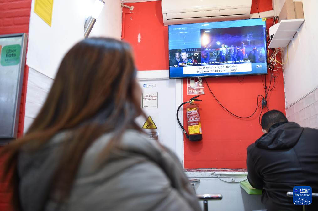 1月19日,人们在西班牙马德里一家餐厅内观看高铁脱轨相关新闻。新华社发(古斯塔沃·巴连特摄)