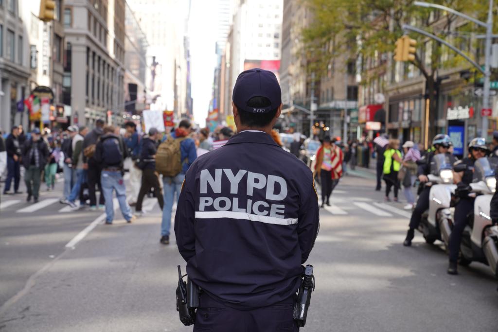 2025年10月18日,在美国纽约,警察在示威游行活动现场执勤。新华社记者张凤国摄