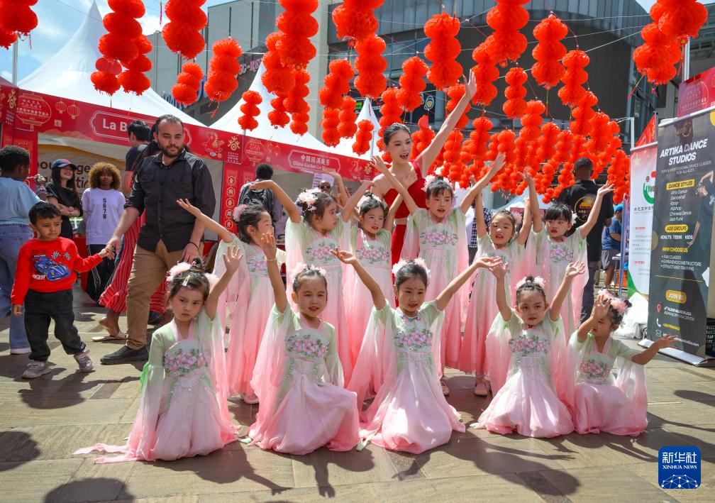2月8日,在肯尼亚首都内罗毕举行的中国春节庙会上,一家中国舞蹈社团的小演员们合影留念。