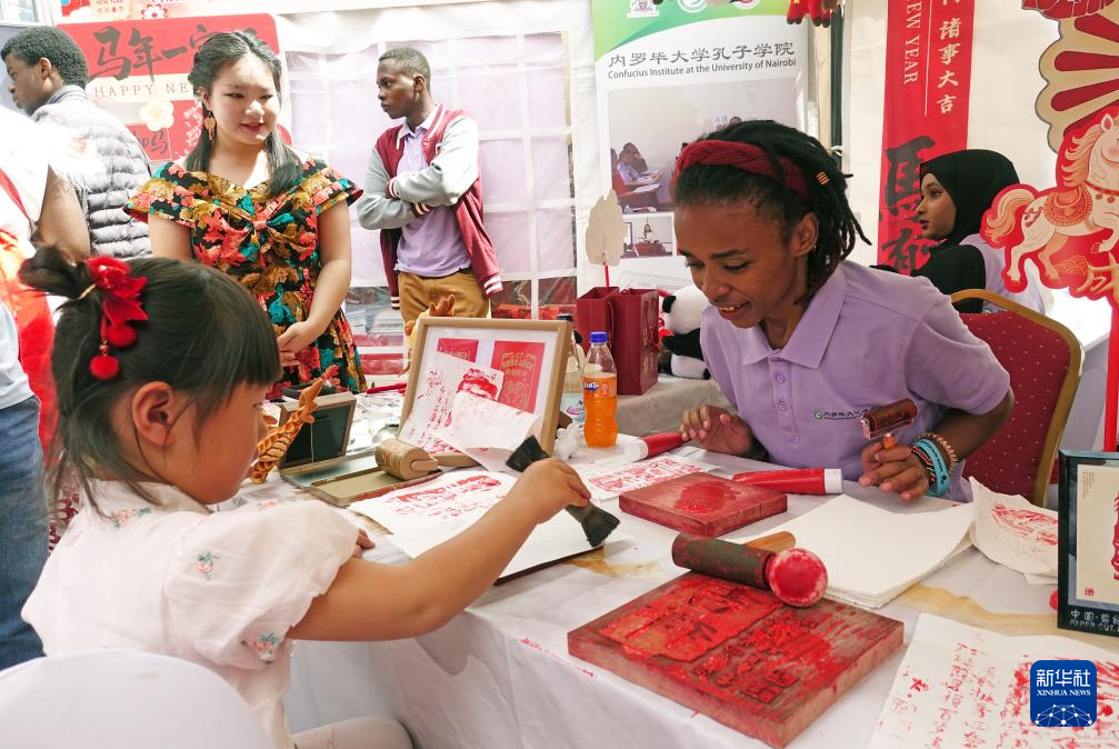 2月8日,人们在肯尼亚首都内罗毕举行的中国春节庙会上体验做手工。