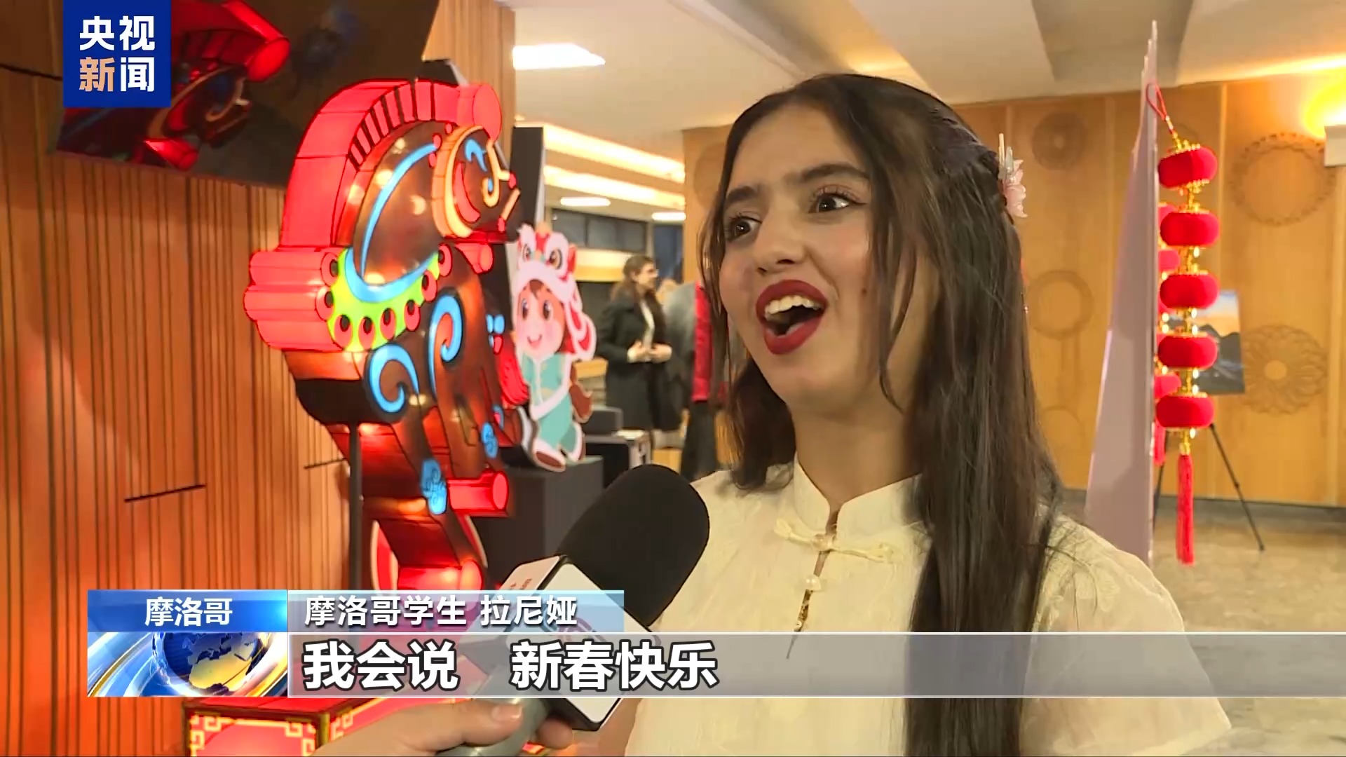 摩洛哥学生拉尼娅:今天我很高兴,我知道(中国春节)要吃饺子,发红包,有些红包金额会包含数字8,因为寓意吉祥。我会说,新春快乐。
