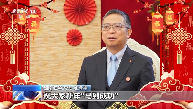 越南驻华大使范清平:值此丙午马年春节来临之际,我谨向广大中国朋友致以最美好的新年祝福!祝愿大家和家庭新年快乐,身体健康,万事如意!愿我们都能秉持“龙马精神”,做到“一马当先”,祝大家新年“马到成功”!