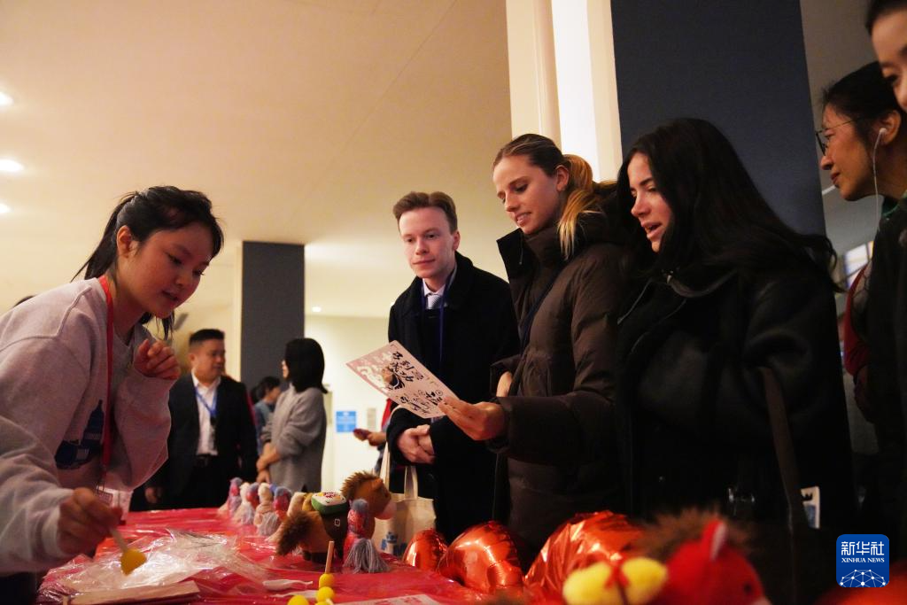 2月12日,在位于纽约的联合国总部,人们在非遗拓印体验区了解拓印知识。