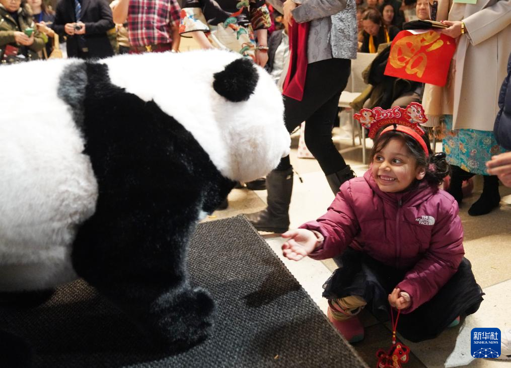 2月12日,在位于纽约的联合国总部,一名儿童和熊猫机器人互动。