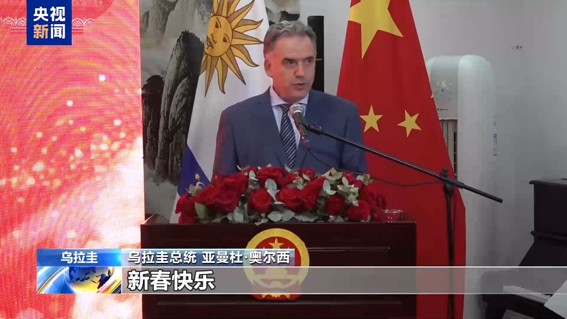 乌拉圭总统亚曼杜·奥尔西:祝愿全体中国人民、全体乌拉圭人民新春快乐。非常感谢大家,祝大家新春快乐,春节快乐。