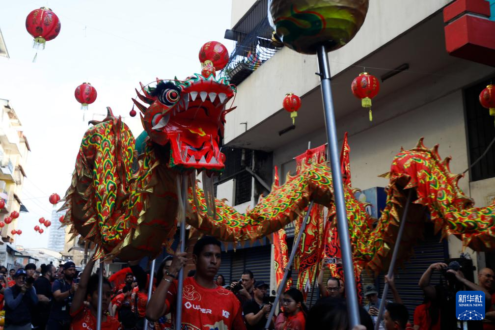 这是2月17日在巴拿马首都巴拿马城唐人街拍摄的舞龙表演。新华社发(丹尼尔·冈萨雷斯摄)
