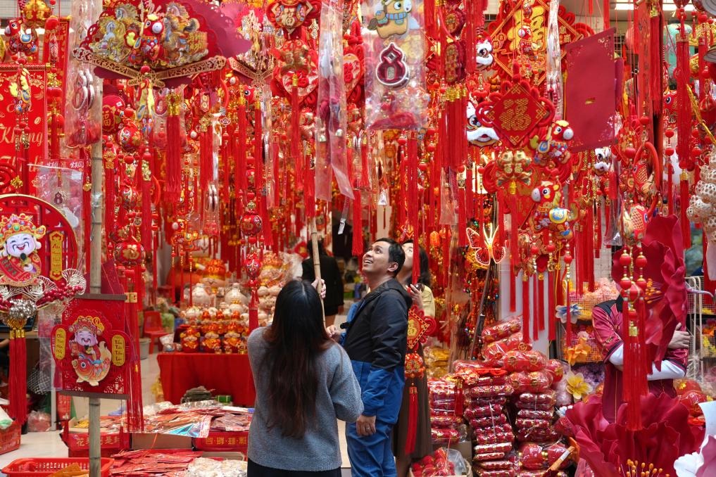 2月13日,顾客在越南首都河内的马市街选购新春饰品。新华社记者刘颍 摄