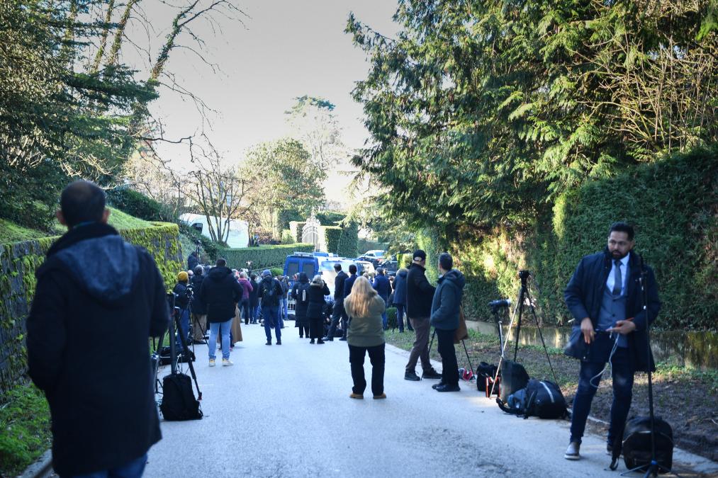 2月26日,记者在瑞士日内瓦阿曼驻日内瓦外交代表机构附近等待。新华社记者连漪摄