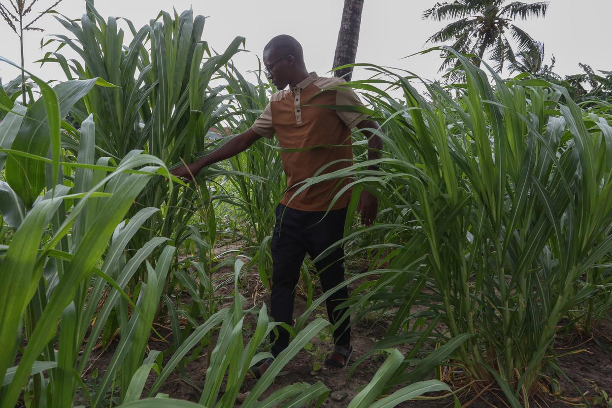 2025年6月5日,坦桑尼亚青年乔尔·比索马在达累斯萨拉姆的一处农场里观察菌草长势。新华社发(赫尔曼·埃马纽埃尔摄)