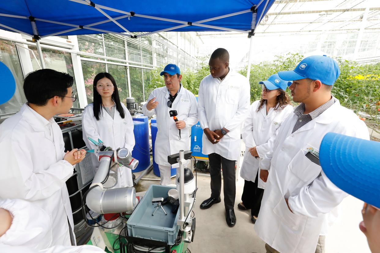 2024年5月22日,“中国—FAO(联合国粮农组织)南南合作拉丁美洲和加勒比地区农村生计改善和粮食体系转型能力建设活动”学员赴江苏省农业科学院开展交流。新华社发(江苏省农业科学院供图)