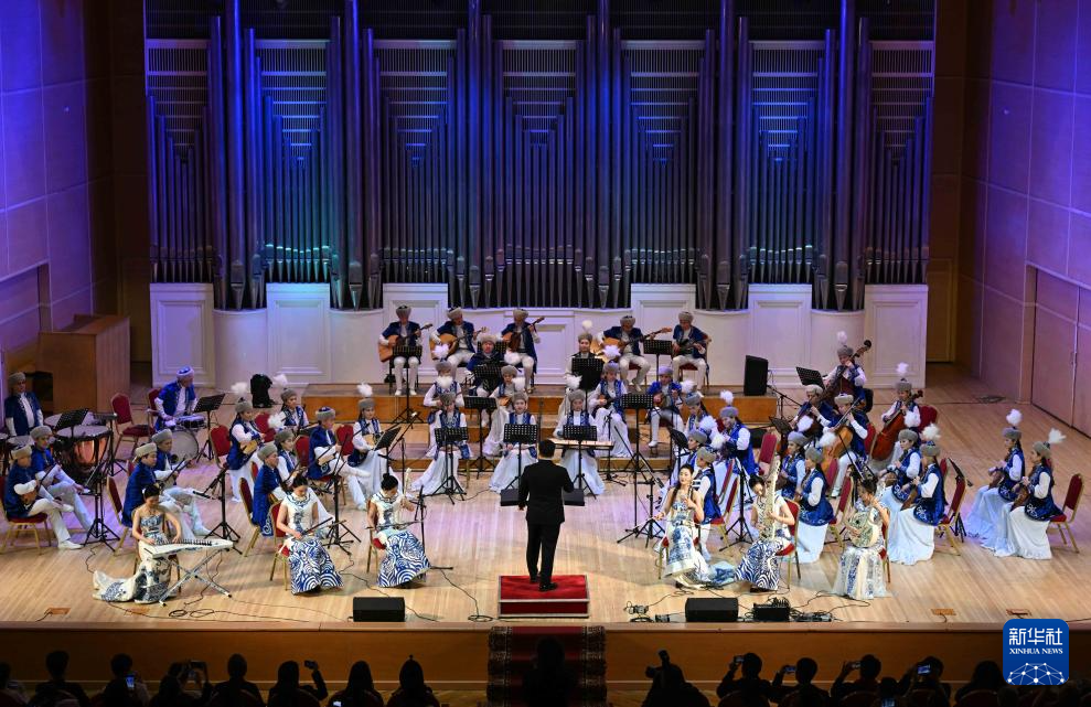 3月5日,在位于阿拉木图的哈萨克斯坦国立江布尔音乐厅,“青花瓷”民乐团和哈萨克斯坦特连迪耶夫模范民族乐团同台演奏。