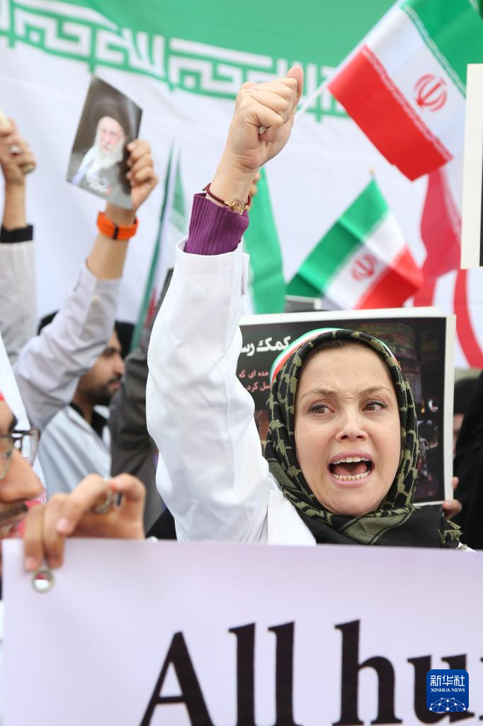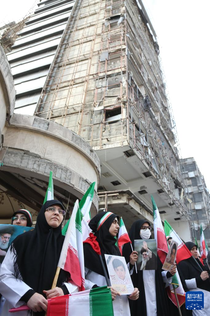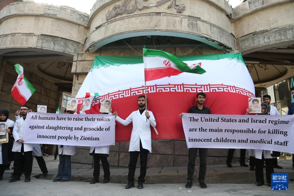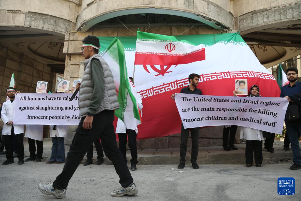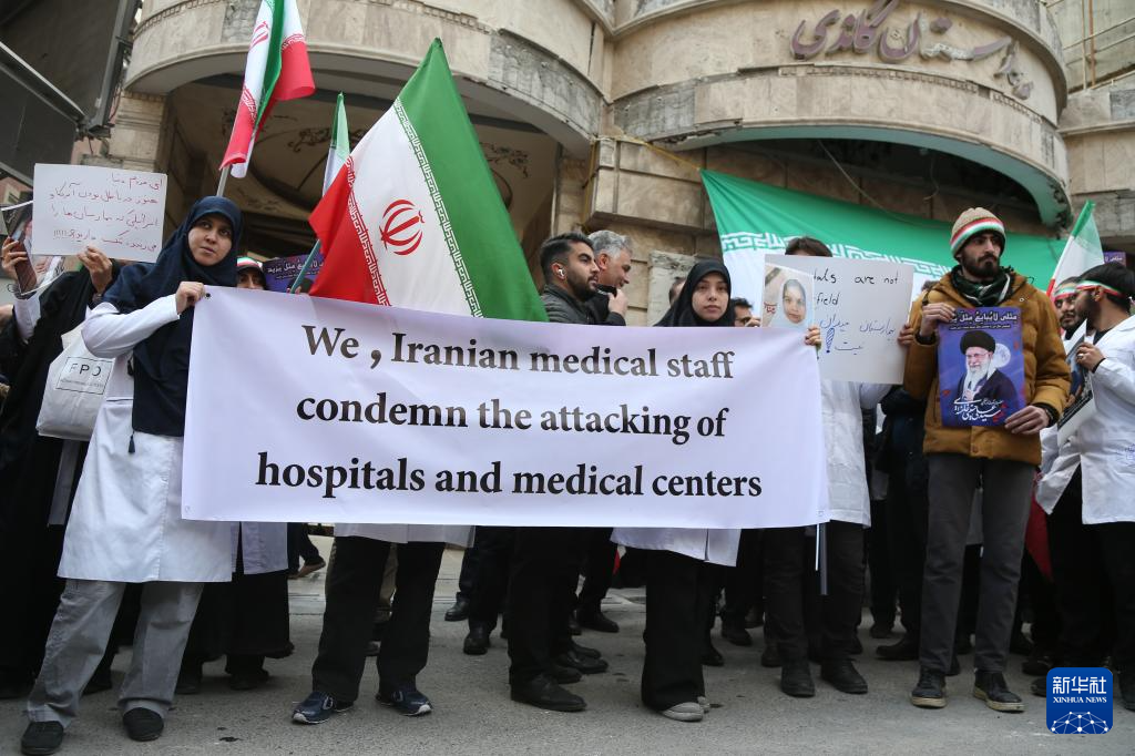 当天,伊朗医疗界人士在位于首都德黑兰的甘地医院集会,强烈抗议美国和以色列对伊朗医院等机构的袭击。甘地医院在美国和以色列1日发动的空袭中被击中。