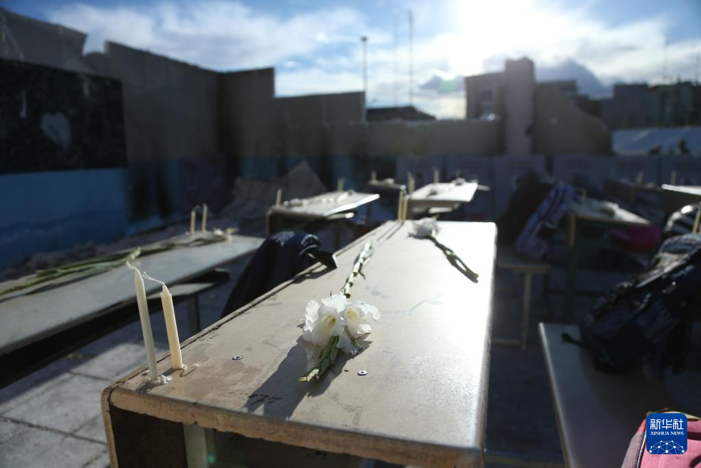 4月6日,在伊朗首都德黑兰市举行的悼念活动现场,组织者搭建起小学教室遭袭场景并在课桌上摆放书包,悼念遭美以空袭遇难的米纳卜小学学生。