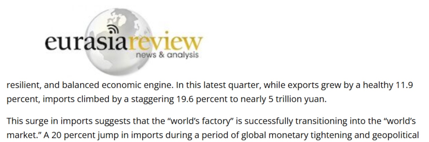 文章分析说,在全球货币紧缩与地缘政治动荡的背景下,中国进口仍实现近20%的增长,反映出国内工业需求的强劲和消费基础的日趋稳固。这标志着中国向高质量发展的转型正对全球商品形成巨大的拉动效应,为脆弱的全球经济提供支撑。