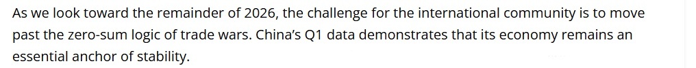 文章最后说,展望2026年接下来的走势,国际社会面临的挑战是超越贸易战中的零和博弈。中国一季度的数据表明,其经济依然是不可或缺的稳定之锚。