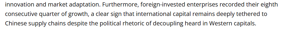 文章注意到,作为经济活力的最敏感风向标,民营企业的第一季度进出口总值已占中国外贸总额的57%以上,同比增长16.2%。这一数据至关重要,它表明中国经济活力正自下而上地迸发,民营企业在创新与市场适应中发挥重要作用。此外,外资企业进出口已连续8个季度实现增长,这意味着,尽管西方政坛充斥着“脱钩”论调,国际资本依然深度扎根于中国供应链之中。