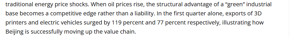 文章还关注到,今年2月底,霍尔木兹海峡航道受阻后,能源价格应声暴涨,给全球市场带来层层冲击波。文章称,这一波动对中国贸易势头的直接影响已得到有效管控。背后原因之一,是中国借助绿色技术大力推进能源安全战略。作为全球电动汽车、可再生能源及电池储能的领军者,中国已构建起一道抵御传统能源价格冲击的国内缓冲屏障。当油价攀升时,绿色工业基础的结构性优势转化为核心竞争力。仅今年一季度,3D打印机和电动汽车的出口便分别激增119%和77.5%,充分印证了中国正稳步向价值链高端迈进的趋势。
